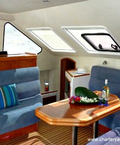 The ample head room, the generous refrigeration space, and the roomy covered cockpit that fully opens into the saloon make for very comfortable cruising.
