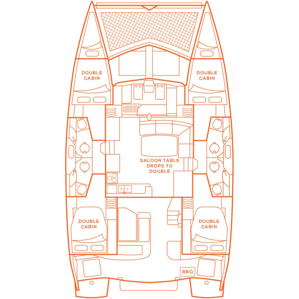 Below deck are 4 double cabins all with their own bathroom with shower and toilet. The cabins providing comfortable sleeping with offshore air conditioning and storage.